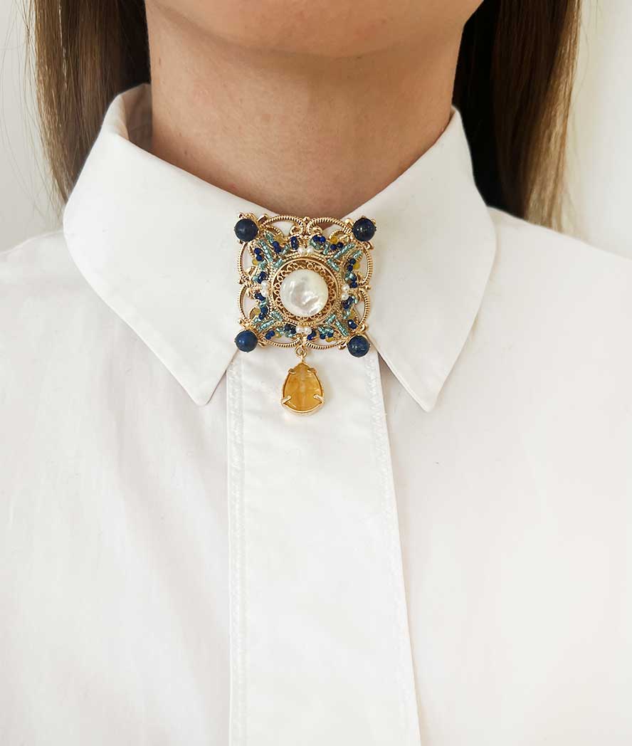 Состав: латунь, позолота, цитрин, жемчуг, лазурит, аквамарин, микрожемчуг